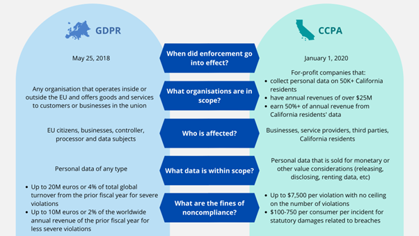 The CCPA took effect in January of 2020 and it gives residents the right to determine how their data are stored and shared as well as to know when and to whom their data are being sold with the possibility to opt-out. Even though this might seem like something similar to GDPR, there is a significant difference concerning how the EU and US look at identification information.