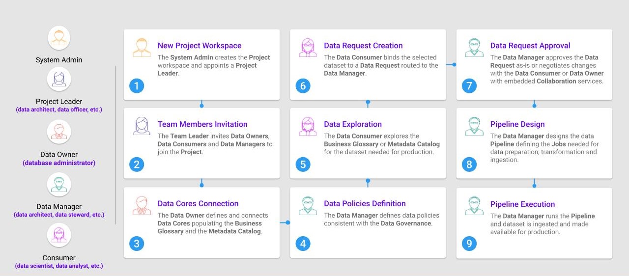 The workflow above provides an example of collaboration in the DataOps setting. As we can see from this workflow, defining roles and responsibilities, sharing common data landscape and automating data requests and governance are the cornerstones of efficient data management where decisions are rooted in data.