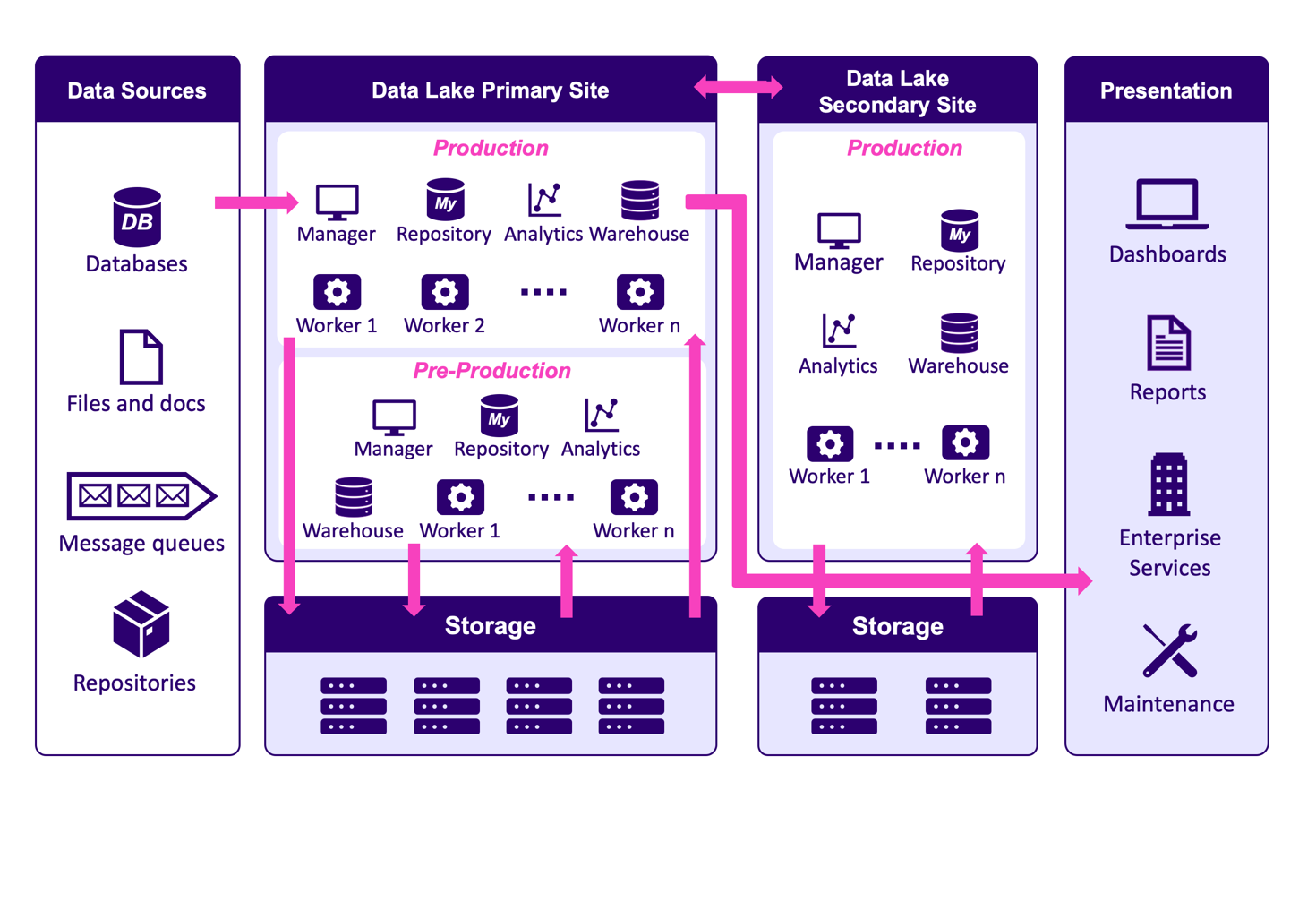 The solution involves the installation and implementation of the technological platform dedicated to the management of consumption measures, within the Integrated Information System of the client. This project is based on the Hadoop platform; in particular, Cloudera’s suite of programs was chosen for Big Data processing. Hadoop works by distributing data across computing clusters, either in the cloud or on-premises, sidestepping the failure rate limitations of even the most powerful single machines. The data collections can be scaled up to larger collections of clusters, known as data lakes. For each processing environment (Production and Pre-production) a data lake, accessible from the Cloud, is configured on shared Dell Isilon storage. Moreover, the disaster recovery process is thoroughly planned and tested, and automated data flows to a secondary site are well-orchestrated to keep all data available for eventual restoring operations. The diagram below represents the architecture of the solution.