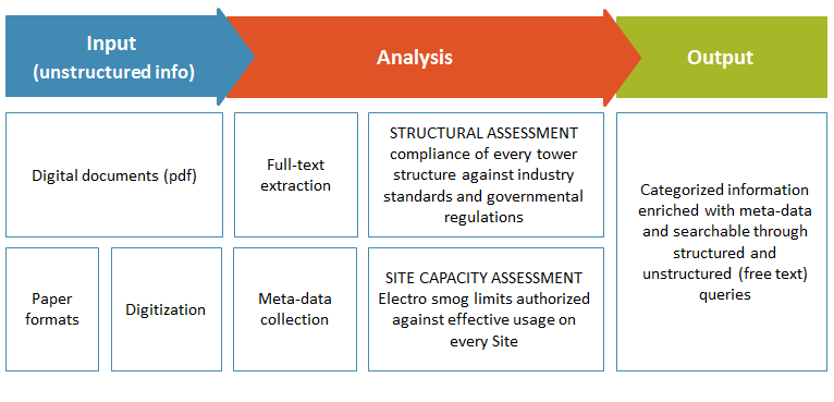 In order to assist the Client in selecting the towers for the sale, according to the the structural compliance, KDM FORCE needed to define a check-list to audit the tower life-cycle documentation and then rapidly implement a process to access and analyse both digital data residing on the Client's systems (ca. 1 Terabyte of data) as well as paper-based content (ca. 20,000 binders).