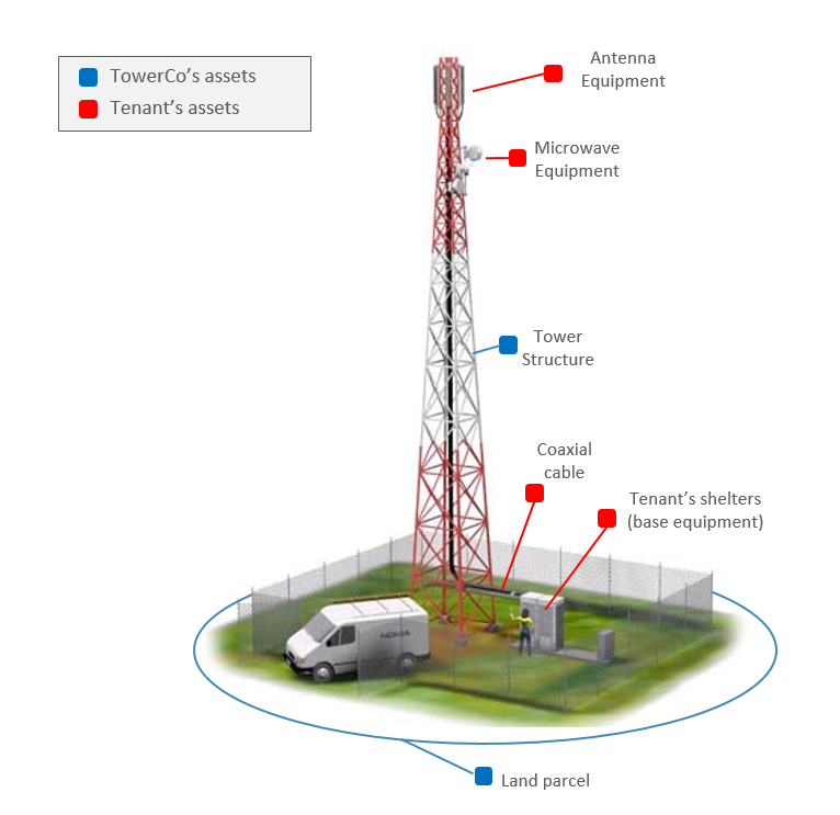 In this scenario, such third party, a "TowerCo" (or an investment firm, like a private equity fund), is an independent business that owns the tower structure of the cell tower and leases the land parcel from the land owner. In this way, the MNO can concentrate on running the telecom equipments (the antennas, the base stations, the HVAC equipments, the shelters, etc.) hosted - under a long-term contract - on the cell tower .