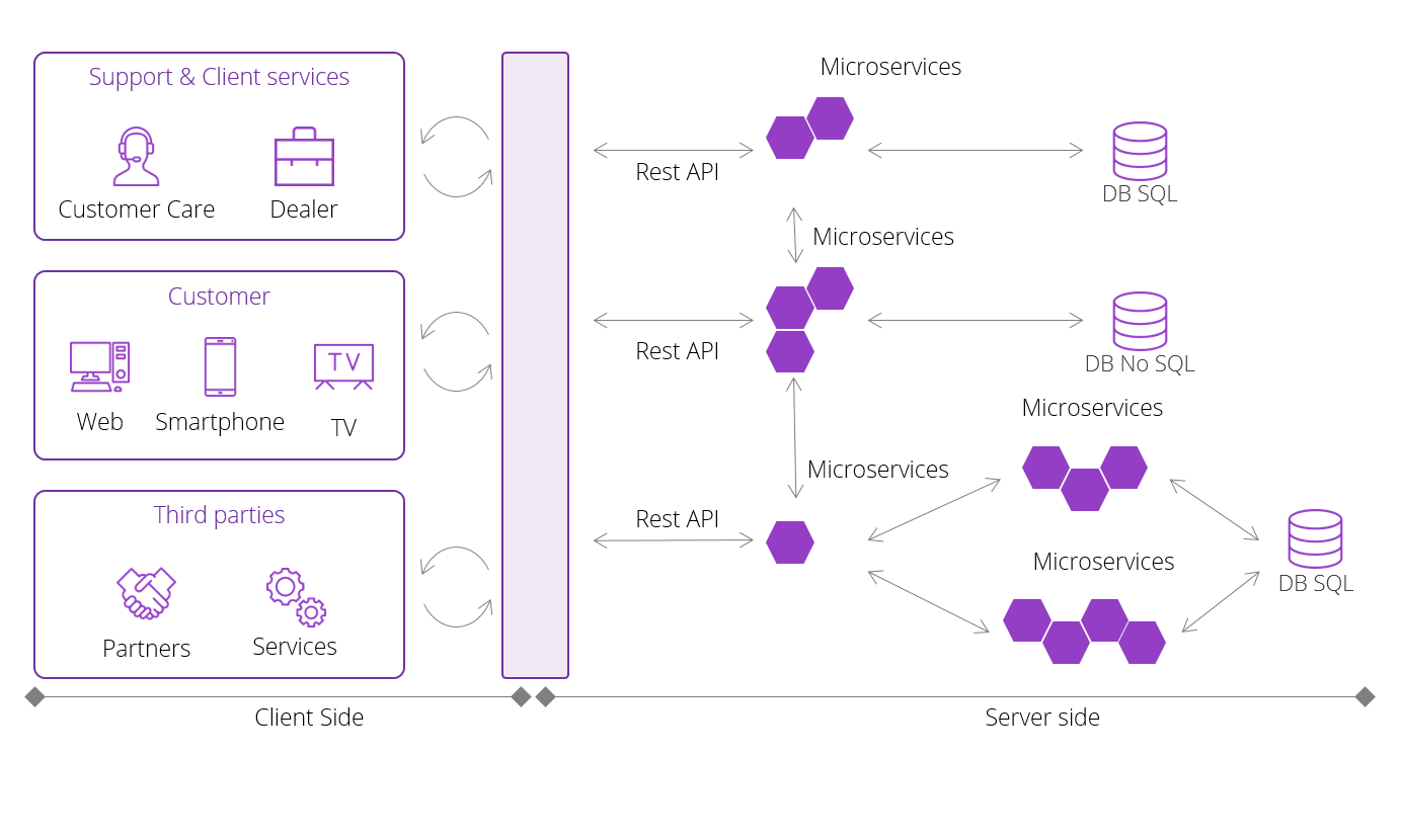 In order to achieve all of the intents of its strategy the Client relied on a new IT architecture based on Dell EMC technologies combined with an open source Big Data and Cloud based technologies stack (Spark, Hadoop, MongoDB, Pivotal, Spring, RabbitMQ, etc.). At the start of the project, very few companies had the competence to carry out a project based on such IT architecture. Fewer had the skills necessary to allow a seamless integration of all customer data stored and managed in several legacy BSS (Business Support System) in order to allow to manage such data from web Apps, Mobile Apps and API gateways, especially when such new architecture had to be scalable, fast and resilient.